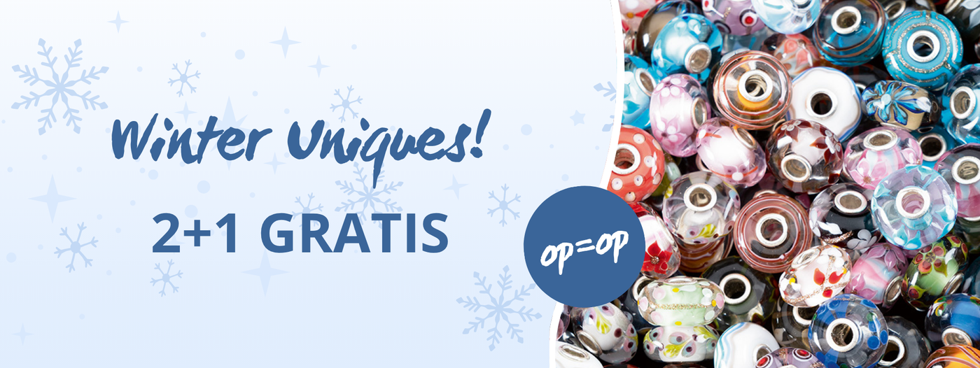 De winter uniques zijn terug! Shop je er 2? Dan krijg je de 3e gratis! Bekijk de bijzondere kralen, vind je favoriet en shop meteen, want op=op!* Let op: wanneer je een unique in je winkelmandje plaatst is hij niet gereserveerd. Pas na betaling is hij van jou.